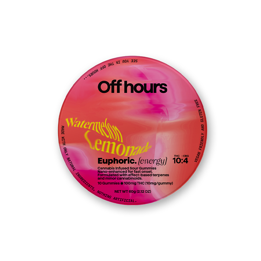 Experience euphoria with Off Hours sour watermelon lemonade gummies, infused with an