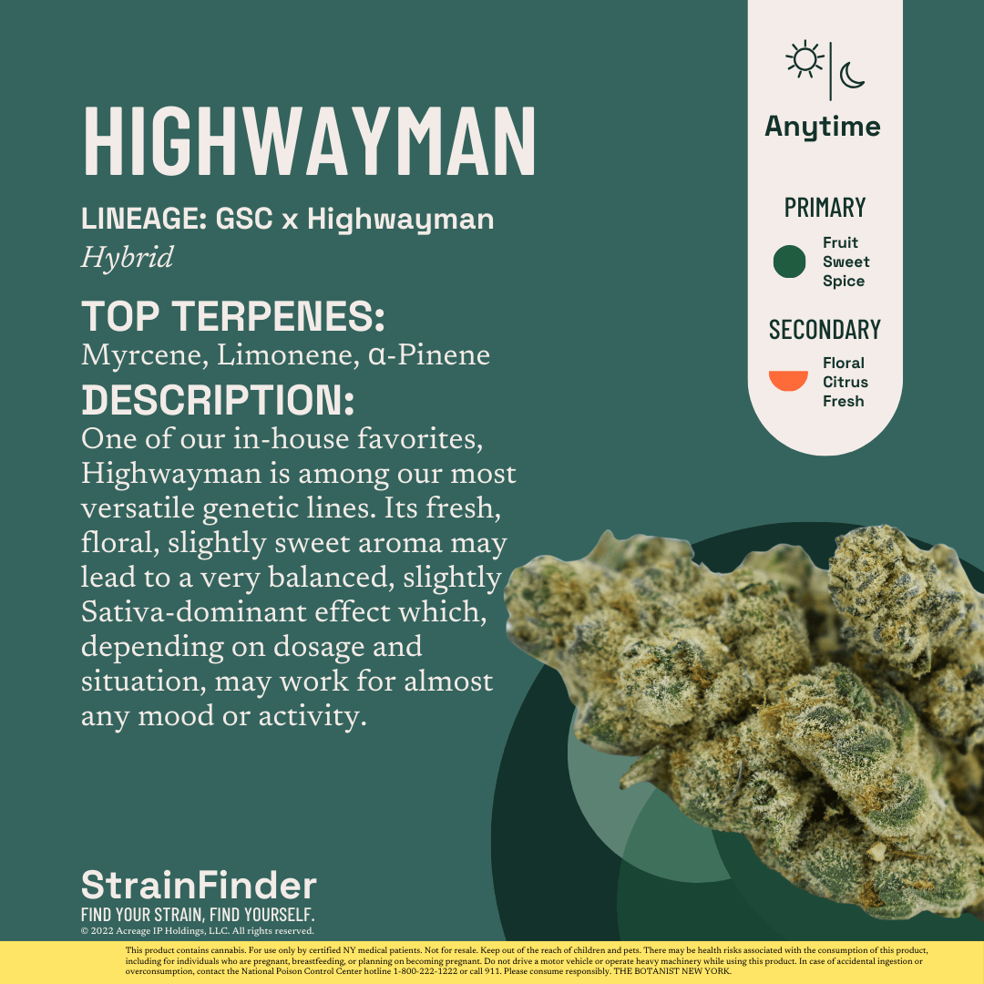 Highwayman is one of our in-house favorites, and is among our most versatile genetic lines. Its fresh, floral, slightly sweet aroma may lead to a very balanced, slightly Sativa-dominant effect which, depending on dosage and situation, may work for almost any mood or activity.
